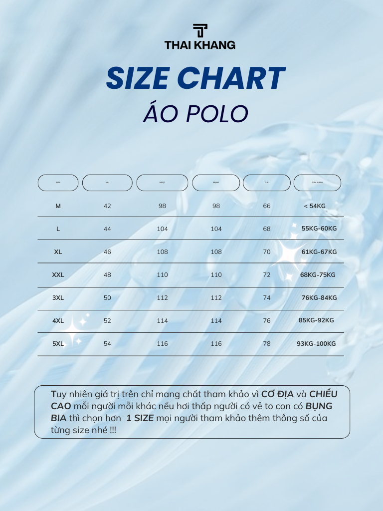 - Bảng size mang tính chất tương đối, quý khách có thể dựa vào số đo trên bảng size để lựa chọn cho phù hợp. nếu có thắc mắc gì về số đo hãy để THÁI KHANG TƯ VẪN KỸ HƠN THEO ĐỘ TUỔI, VÓC DÁNG, SỞ THÍCH của quý khách nhé!