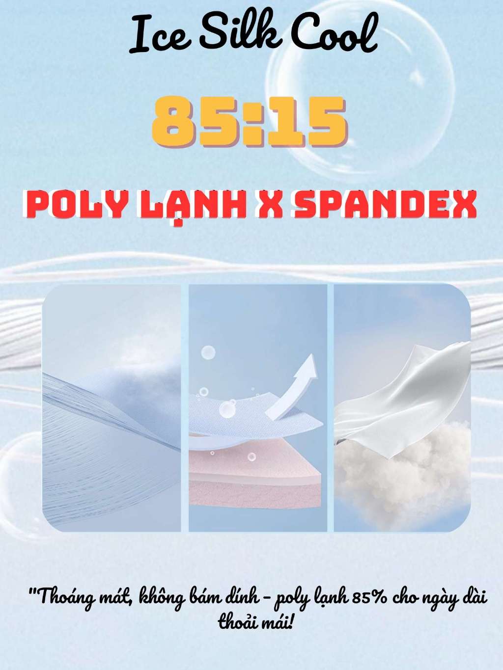 Chất vải Ice Silk Cool là điểm nhấn nổi bật của sản phẩm. Với thành phần 85% Poly lạnh và 15% Spandex, áo thun không chỉ mềm mại, mát mẻ mà còn có độ co giãn tốt, giúp người mặc cảm thấy thoải mái trong suốt cả ngày dài. Poly lạnh giúp áo luôn giữ được sự mát mẻ ngay cả khi hoạt động trong điều kiện thời tiết nóng bức, còn Spandex đảm bảo độ co giãn, vừa vặn ôm sát cơ thể mà không gây khó chịu.